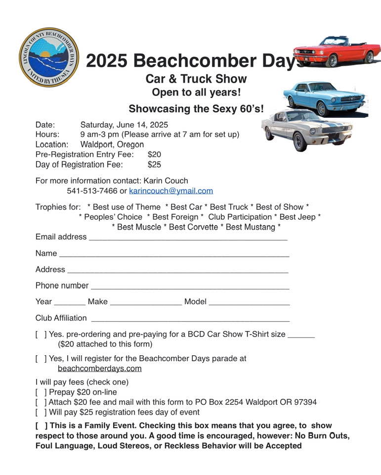 The 69th Waldport Beachcomber Days Car Show is Saturday from 9am to 3pm on Highway 34 between Verbena and John Streets.