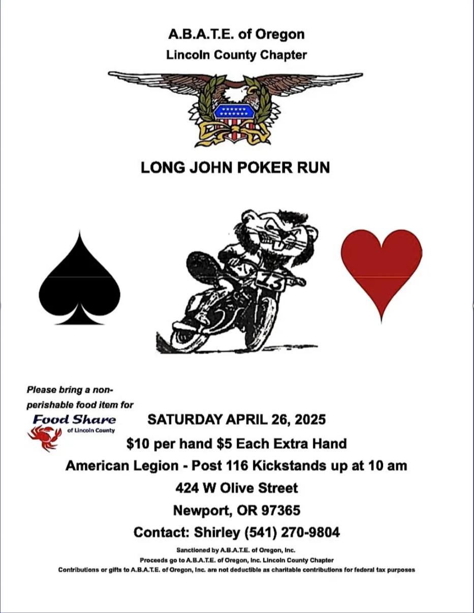 The Long John Poker Run is Saturday at 10am at the American Legion, 424 West Olive Street.