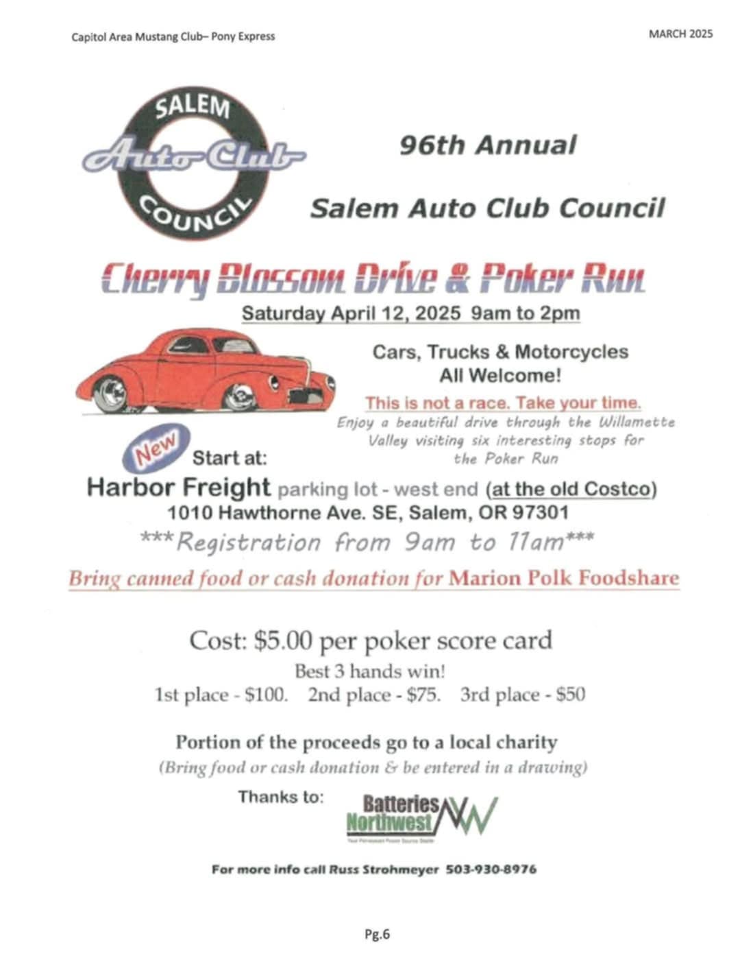 The 96th Annual Cherry Blossom Drive & Poker Run is Saturday from 9am to 2pm at Harbor Freight, 1010 Hawthorne Avenue.